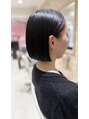 スタイルは顎ラインの切りっぱなしボブ。全体に酸性ストレートパーマを施しております。酸性ストレートを当てることで、スタイリングがかなりラクになり、よりはっきりラインを出せます。