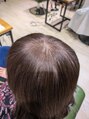 赤味を抑えたくすみのあるグレージュ系カラー。根元から透明感のある明るさと白髪も同時にカバーしています。白髪比率80%