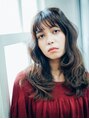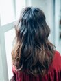 ロングのパーマスタイル!全体に大きめカールで動きがついてるスタイルなので重くならずに適度にラフ感が出ます。バングは透け感を出してさらに軽い印象になります!