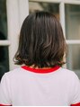 肩につく長さでワンレンベースの切りっぱなしボブです。バングはカールして目にかかる長さで長めに残してシースルー気味に作りました。
