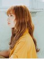 ぱっつんバングにオレンジ系カラーのオルチャン風ヘアです。ハイトーンのオレンジ系カラーにすることでツヤ感がでやすくなります。重ためのカットベースに波ウェーブで仕上げることによりティーンズ・ガーリーな雰囲気をだします。