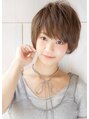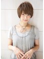 い、毛先のみアンニュイカール。モダンショートとグレージュショートの混ざったスタイルです。無造作な毛先はワンカールで巻いてます。前下がりだけどマッシュなスタイルで黒髪でも似合います。