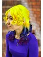 根元から中間までイエローで、毛先はブルー~パープルのグラデーションに。グラマラスなラフウェーブで動きをつけて。【派手髪】【ハデ髪】【マニックパニック】【マニパニ】