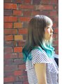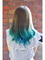 グレー系のベースから、ターコイズブルーへのグラデーション。一か月前に赤に染めているところからのチェンジで、ブリーチに苦労したが、きれいに正反対の色に変更できた。【派手髪】【ハデ髪】【マニックパニック】【マニパニ】