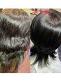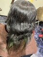 捻転性で多毛のゲストさま。襟足のポイントに入ってるグリーンは活かして、全体的に乾かすだけで簡単に収まるように施術させて頂きました。