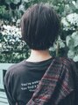 ぱつっと眉上になるくらいの長さでカットすることで すこしモード感、抜け感をだしています。 全体をダークグレージュに染めて、暗いけど 透明感のあるカラーです。 ショートだけど、襟足をあえてすこし重めに切る事で柔らかさをだしています。