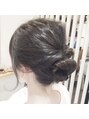 ハーフアップでとり、ゴムでひとつにまとめ、くるりんぱします。のこりの毛束をひとつにとめ、毛先はまるくなるように折り曲げてとめます。ぎゃくりんぱをして毛先がでないようにゴムあたりをしめます。全体をほぐして完成です。ピンなしアップスタイルです