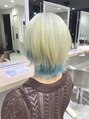 透明感のあるホワイトブロンドに、毛先だけアイスブルーをプラスしたデザイン。派手すぎず抜け感のあるアクセントで、ショートウルフのシルエットがより引き立ちます◎