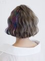 プラチナアッシュボブです。インナーカラーにカラフルなデザインカラーを施しています。ダブルカラーで高明度のカラーですが、色彩を濃く入れることで長持ちします。色が落ちていく過程も楽しめる二度おいしいカラーです。
