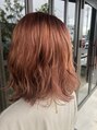 肩につくぐらいの切りっぱなしのミディアムヘア。1度ブリーチしたベースに柔らかさのあるオレンジと透明感が出しやすいベージュ を組み合わせた暖色系カラーです!!夏っぽく元気が溢れるような色味は明るめカラーしたい方にオススメです!!!