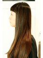 幅を広めにとったショートバングで、ちょっぴり個性的に!!髪全体をグラデーションで染めることで、ナチュラルな柔らかさと、動きを出しています。前髪は、低音デジタルパーマ、毛先は、まとまりよく疎水トリートメントで、栄養補給をしています。