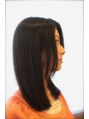 重めAラインのスタイル。黒髪の重たい感じが出ないように、顔周りと毛先に動きをつけて、大人の余裕を感じさせるスタイルに。スタイリングも簡単です。