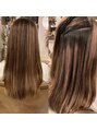 中間部分のうねり、毛先はブリーチでのハイライト、カラーでのダメージで乾燥での広がりも起こしています。根本を弱酸性、中間から毛先は酸性の領域での薬剤設定で髪の負担を極力抑えてからの施術をすれば柔らかいストレートの完成です♪