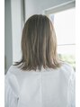 前下がりのミディアムボブベースで、毛先はパツッとブラントカット。全体にダメージレス縮毛矯正をかけて、柔らかいストレートヘアに。軽めの前髪と、ハイトーンカラーで透け感をプラス。