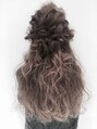 細かいウェーブつけて、トップからざっくり編み込んで、サイドはねじり編み崩して、バックでまとめます。下ろした髪はルーズにほぐしてラフなヒッピー風アレンジ。