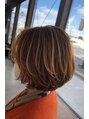 細めのハイライトで立体感を出したショートボブ。動きの出るレイヤーと柔らかいカラーで、軽さと透明感のある仕上がりにしています。白髪ぼかしにも使えます。スタイリングも簡単で、動きのあるショートスタイルを楽しみたい方におすすめです。