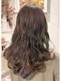 ロングスタイルにカットし、表面に重ためのレイヤーを入れて軽さを出すぎないようにコントロールします。やや前上がりのシルエットでカットし、顔周りにアクセントを付けます
