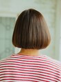 少し前下がりで丸いシルエットのアゴ下ボブ。毛先に重さを残してカットしているのでバングは短めで束感を出して重たくなりすぎないようにバランスを取っています。カラーリングは赤みのないナチュラルなブラウンカラー。【新小岩】