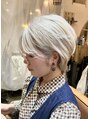 ハイトーンのブロンドカラーのショートヘアです。レイヤーを入れる事で立体的なシルエットにしてます。 眼鏡やピアス等のアクセサリーも合いますね!