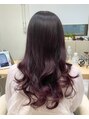 独自に使用する優しい剤と各種髪質改善成分を配合しハリツヤのあるカールスタイルに。カラーには今季トレンドの赤髪としてラベンダーピンクに。アルカリカラーオンリーだとダメージや色の再現が難しいので、タール色素を使用しダメージレスに。