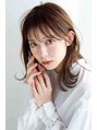 顔まわりにしっかりレイヤーを入れた、動きのあるミディアムスタイル。流した前髪が女性らしさを引き立て、明るめのブラウンカラーが透明感を演出します。毛先の内巻きカールが柔らかな印象に。
