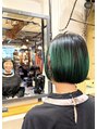 根本を残したハイライトにグリーンを入れたヘアカラーが際立つスタイルです。金髪より締まりがでてスタイリッシュに仕上がります