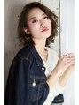 立ち上げバングで少しラフ大人のボブスタイルです。ナチュラルな毛先の質感で気取らない感じがgoodです。外ハネや内巻きのスタイルどちらでも、素敵になります。デニムスタイルにぴったりです。