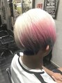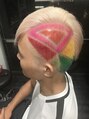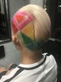左の刈り範囲を広めにとり、左から右のツーブロック部分に三角のバリカンアート。バリカンアート部分は色相環カラーにいたしました。上部分は右に流した際に上から白、ピンク、水色のグラデーションになるようカット、カラーいたしました。