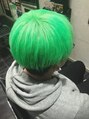 もともとハイトーンのお客様でしたので、根元ブリーチリタッチを2回した後、蛍光ミントグリーンに仕上げました!通常ですと2、3回ブリーチをして白っぽくベースをつくります。