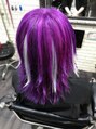ブリーチした後、地毛をパープルに染めて、白のエクステでメッシュになるようにつけさせて、外ハネに仕上げました!派手髪 個性的 原色カラー V系