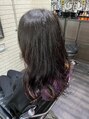 インナーのブリーチ部分に紫ベースで黄色もアクセントとしてカラーいたしました。巻き方、ほぐし方で黄色が目立ったり、密かに見せたりなど楽しみ方自由です~