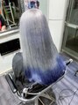 もともと明るい髪色根元ブリーチリタッチしたのちに、シルバーからのネイビーのグラデーションにいたしました。髪の毛を前にもっていったときに、裾カラーに見えるように、仕上げております。