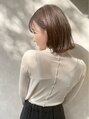 あご下で水平にぱつんと切りそろえたボブに透明感たっぷりのクリアベージュカラーを合わせたトレンドスタイル。シアバターを揉み込んでスタイリングするだけで、毛先に動きが出るようにこだわってカットしています。