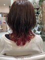 ブリーチ毛ベースのインナーカラーにピンクとバイオレットのカラートリートメントをオンカラーしました。レイヤーの入ったカットがベースなのでインナーカラーもかなり目立ちますがこれから春に向けてオススメのカワイイヘアスタイルです!