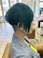 スモーキーグリーンと刈り上げアシメショート【広島派手髪】【広島ハイトーンカラー】【広島バレイヤージュカラー】【広島ウルフカット】【広島白髪ぼかし】【広島ケアブリーチ】【広島美容室】【広島ヘアカラー】【広島インナーカラー】【広島髪質改善】