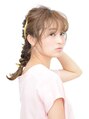 両サイドに毛束を残しくるりんぱを1回。残していた髪を左右からねじって中央に持っていき、まとめて三つ編みで仕上げました。程よくほぐした毛束と、ヘアアクセサリーを複数使いしたことがポイント。結婚式や二次会にも。【EARTH熊本光の森】