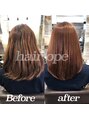 従来の縮毛矯正とは薬剤が違い、髪を溶かさずに綺麗な円形毛に整えてツヤのある柔らかなナチュラルストレートヘアーになり、コテ巻き、ブローも可能 です。
