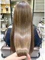 少しクセが気になるけど、透明感があるカラーがしたい人に向けた提案他店とは違うストレートヘア+透明感カラーを手に入れられます。縮毛矯正ではなく、ツヤツヤでふわっと自然なストレートヘアになれる薬剤と技術です。髪の状態によってブリーチが必要です。