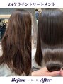 クセが気になるけど、透明感があるカラーがしたい人に向け「ストレートヘア+透明感カラー」を手に入れたい方にオススメです。縮毛矯正ではなく、ケラチンタンパクの効果でツヤツヤでふわっと自然なストレートヘアになれる薬剤と技術です。