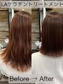 クセが気になるけど、透明感があるカラーがしたい人に向け「ストレートヘア+透明感カラー」を手に入れたい方にオススメです。縮毛矯正ではなく、ケラチンタンパクの効果でツヤツヤでふわっと自然なストレートヘアになれる薬剤と技術です。