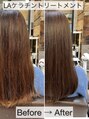 クセが気になるけど、透明感があるカラーがしたい人に向け「ストレートヘア+透明感カラー」を手に入れたい方にオススメです。縮毛矯正ではなく、ケラチンタンパクの効果でツヤツヤでふわっと自然なストレートヘアになれる薬剤と技術です。