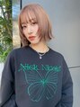 フェイスレイヤーを入れた切りっぱなしボブ。ブリーチ1、1,5回して色を抜いた後にココアベージュ系カラーでオンカラー。まっすぐにして毛先外はね感を出すのがスタイリングポイント。