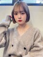 切りっぱなしボブでシースルーバング。カラーはブリーチ後にベージュをオン。輪郭カバーのために耳周りを丸くするようにセットして毛先はストンとすれば完成。