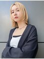 ブロンドベージュのフェイスレイヤーボブ。ブリーチ2回して、ホワイトベージュでオンカラー。カットは顔まわりを包むようにレイヤーを入れて完成