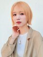 オレンジベージュのフェイスレイヤーボブ。ブリーチ2回して、ホワイトベージュでオンカラー。カットは顔まわりを包むようにレイヤーを入れて、前髪はシースルーバングで完成。