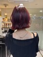 艶のあるワインレッドカラーが印象的な外ハネボブ。光の下で深みと透明感が交差し、動くたびにツヤが際立つ大人フェミニンなスタイル。ブリーチ履歴を活かした発色で、個性と上品さを両立。