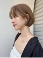 切りっぱなしボブでカット後、フロントにカーテンバングを作り、流れやすくレイヤーを入れる。スタイリング苦手な人はパーマでセットは朝たったの3分に。カラーはブリーチ後に赤味を抑えたモカベージュでオンカラー。