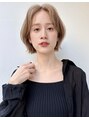 切りっぱなしボブでカット後、フロントにカーテンバングを作り、流れやすくレイヤーを入れる。スタイリング苦手な人はパーマでセットは朝たったの3分に。カラーはブリーチ後に赤味を抑えたモカベージュでオンカラー。
