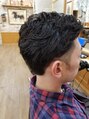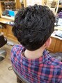 サイドをがつっと刈上げて、ネープは程よく刈上げます。全体に1,5回転のパーマをかけてジェルでオールバックに!無造作感を作って完成です。