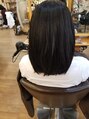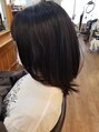 ブルーブラックです。黒染めよりも青っぽい!染める前のレベルが高いほど青みが増していきます。今回はナチュラルトーンからのトーンダウンでした。カットは顔周りにレイヤーを入れ軽やかに。
